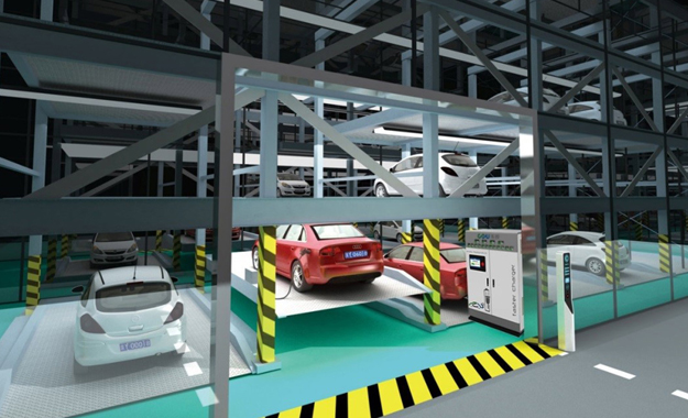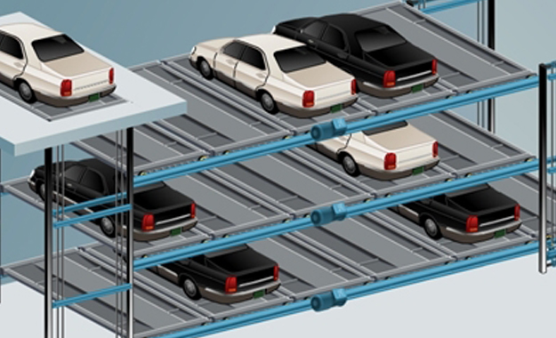 多層循環(huán)類立體車庫通過載車板左右移動(dòng)和上下移動(dòng)的相互配合使載車板循環(huán)運(yùn)動(dòng),從而實(shí)現(xiàn)車輛多層存放。