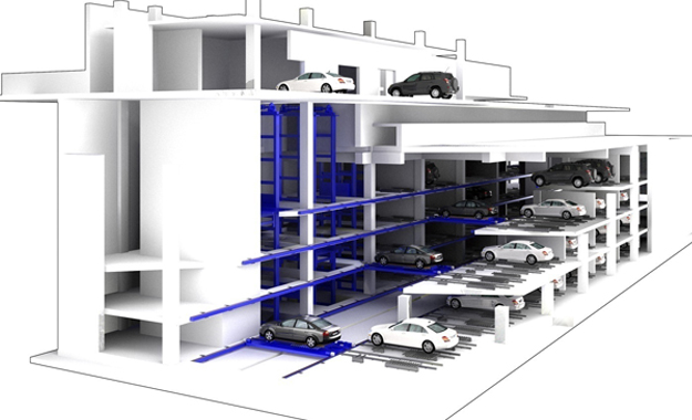 平面移動(dòng)類產(chǎn)品是在同一水平層上用搬運(yùn)器平面移動(dòng)汽車或載車板,實(shí)現(xiàn)存取汽車的機(jī)械式停車設(shè)備,多層平面移動(dòng)類停車設(shè)備還需要升降機(jī)來(lái)實(shí)現(xiàn)不同層間的升降。設(shè)備內(nèi)利用激光測(cè)距來(lái)行走定位,采用光通訊無(wú)線信號(hào)傳送,變壓變頻(VVVF)驅(qū)動(dòng)和微機(jī)控制方式使整座車庫(kù)實(shí)現(xiàn)低振動(dòng)、低噪聲、低成本和高效率的運(yùn)行?蓛(nèi)置自動(dòng)升降旋轉(zhuǎn)裝置,配以先進(jìn)的導(dǎo)航指示,無(wú)須司機(jī)倒車,自動(dòng)化程度高,有著其他類型車庫(kù)無(wú)法比擬的技術(shù)優(yōu)點(diǎn)。